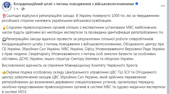 В Координационном штабе отметили, что репатриационные мероприятия удалось провести благодаря работе сотрудников штаба, Объединённого центра при СБУ, ВСУ, МВД, Офиса уполномоченного Верховной Рады по правам человека, Секретариата уполномоченного по лицам, пропавшим без вести, и ГСЧС.