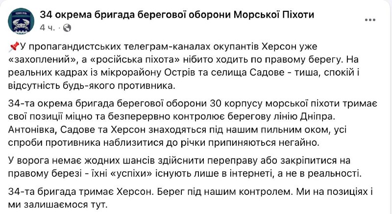 Центр противодействия дезинформации тоже высказался на эту тему: он опроверг потерю микрорайона Остров, что находится севернее, в самом Херсоне, а также острова Карантинный. Однако организация при этом сослалась на заявление 34-й бригады, которая, как уже упоминалось, опровергла только заход россиян на правый берег.