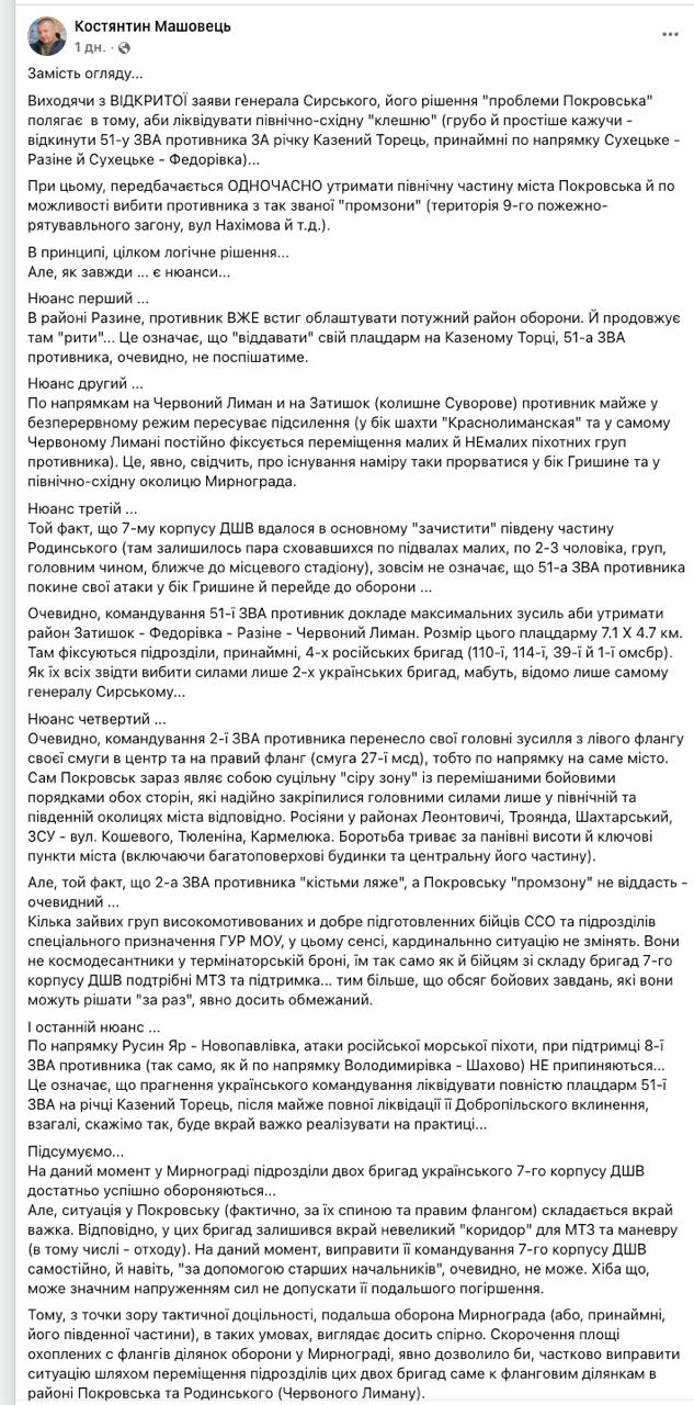 "Исходя из открытого заявления генерала Сырского, его решение "проблемы Покровска" заключается в том, чтобы ликвидировать северо-восточные "клещи" — проще говоря, отбросить 51-ю общевойсковую армию противника за реку Казённый Торец, по крайней мере в направлениях Сухецкое – Разино и Сухецкое – Фёдоровка. При этом предполагается одновременно удержать северную часть Покровска и, по возможности, выбить противника из так называемой "промзоны" (район 9-го пожарно-спасательного отряда, улица Нахимова и т. д.)", - пишет Машовец.