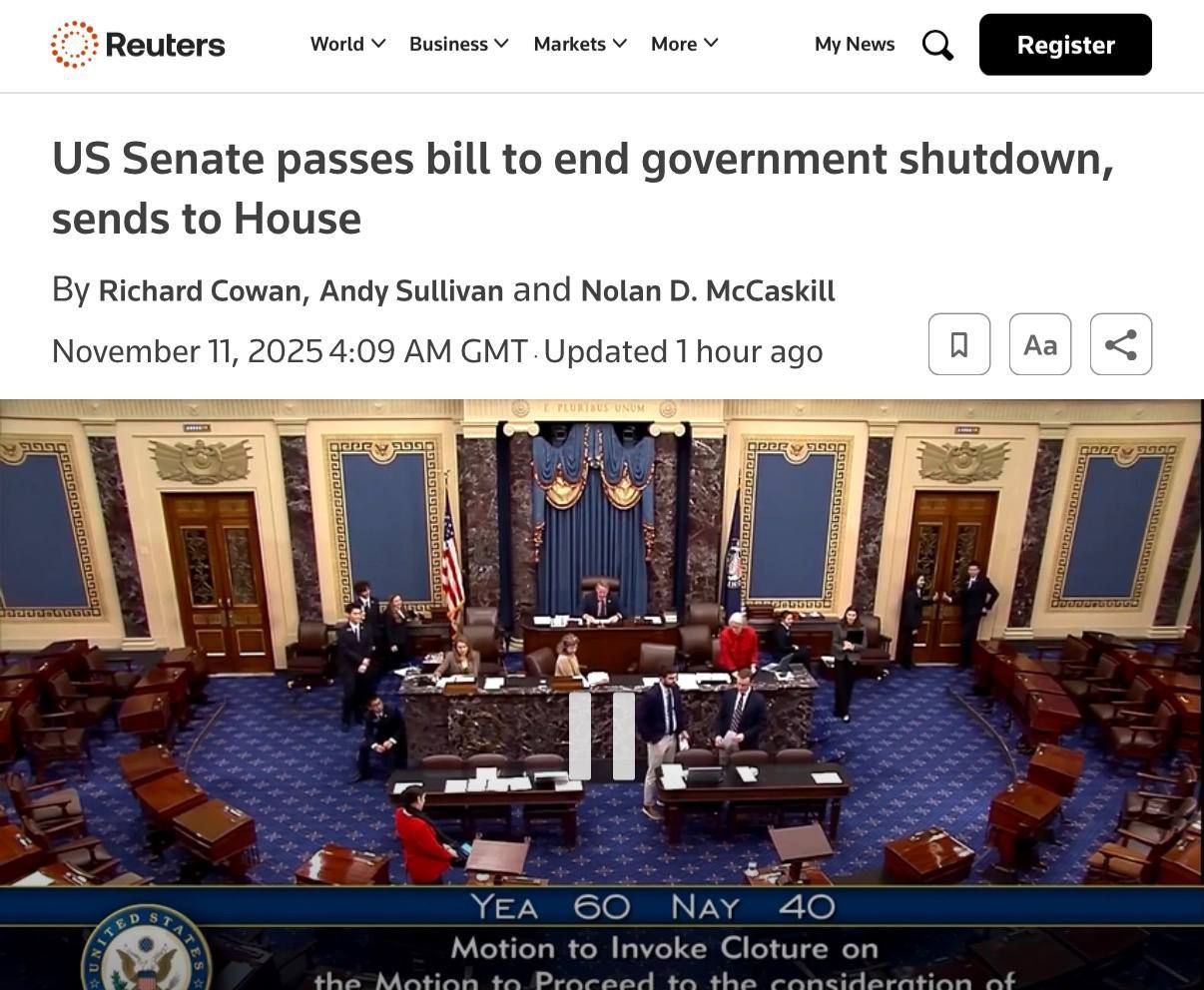 В США сделали первый шаг к преодолению рекордно затянувшегося шатдауна. Сенат одобрил законопроект, направленный на завершение остановки финансирования правительства.