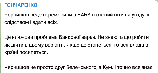 "Это ключевая проблема Банковой сейчас. Не знают, что делать и как действовать в этом варианте. Если это произойдет, то вся власть в стране посыплется. Чернышов не просто друг Зеленского, а кум. И точно все знает", – пишет он.