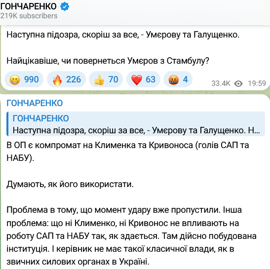Следующие подозрения, по мнению Гончаренко, будут выписаны секретарю СНБО Рустему Умерову и министру юстиции Герману Галущенко.
