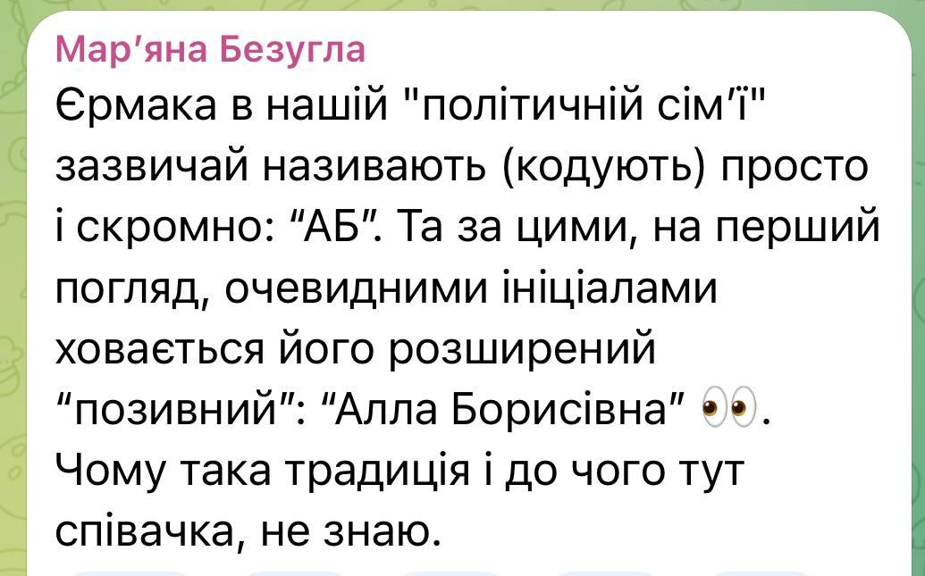 "Ермака в нашей "политической семье" обычно называют (кодируют) просто и скромно: АБ. Да, за этими на первый взгляд очевидными инициалами скрывается его расширенный "позывной": Алла Борисовна". Почему такая традиция и при чем здесь певица, не знаю", - написала Безуглая.