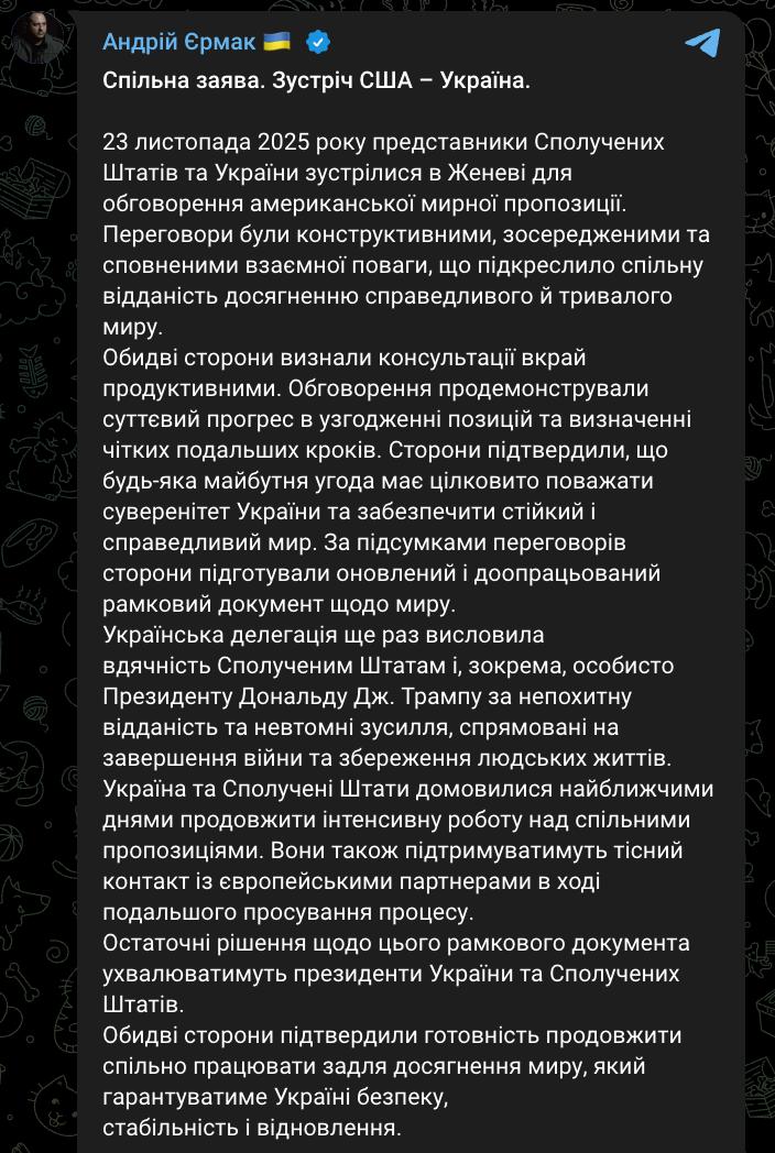 "23 ноября 2025 года представители Соединённых Штатов и Украины встретились в Женеве для обсуждения американского мирного предложения. Переговоры были конструктивными, сосредоточенными и исполненными взаимного уважения, что подчеркнуло общую приверженность достижению справедливого и длительного мира.