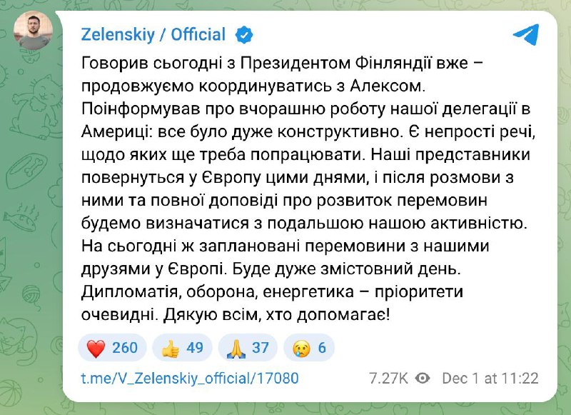 "Все было очень конструктивно. Есть непростые вещи, по которым еще нужно поработать. Наши представители вернутся в Европу на днях, и после разговора с ними и полного доклада о развитии переговоров будем определяться с нашей активностью", - сказано в публикации президента.
