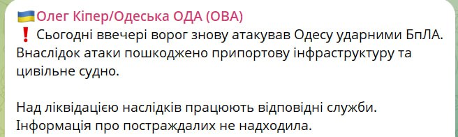 23.10 В результате вечерней атаки БпЛА на Одессу повреждены припортовая инфраструктура и гражданское судно, сообщает глава ОВА Кипер.