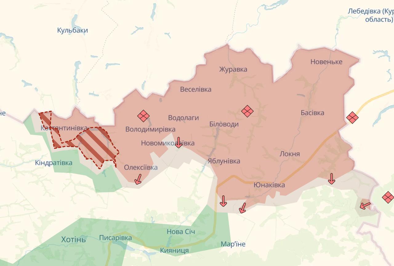 10:39 Армия РФ продолжает продвижение в Сумской области после длительного перерыва, свидетельствует карта Deep State. На этот раз россияне продвинулись в западной части своего плацдарма, около Кондратовки.