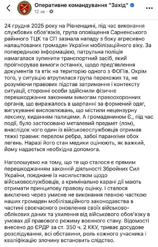 13:19 В Ровенской области сотруднику ТЦК ломом сломали ребро, сообщает оперкомандование "Запад".