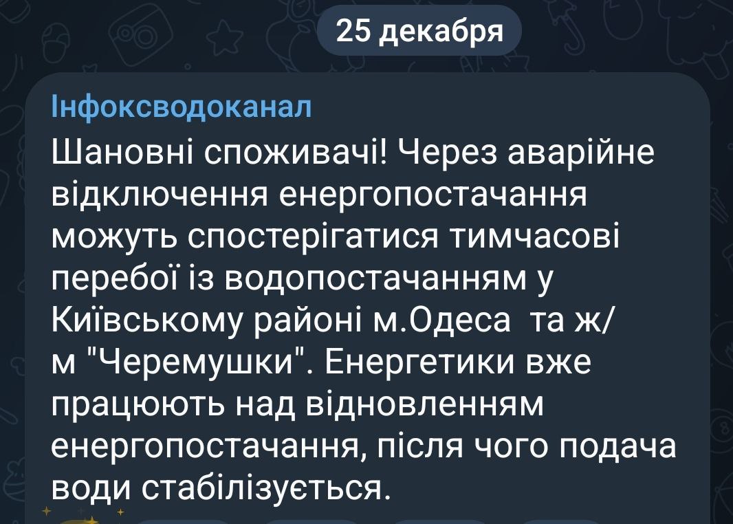 08:20 В Одессе на фоне аварии в энергетической системе начались перебои с водой, сообщает водоканал.