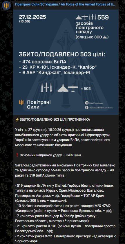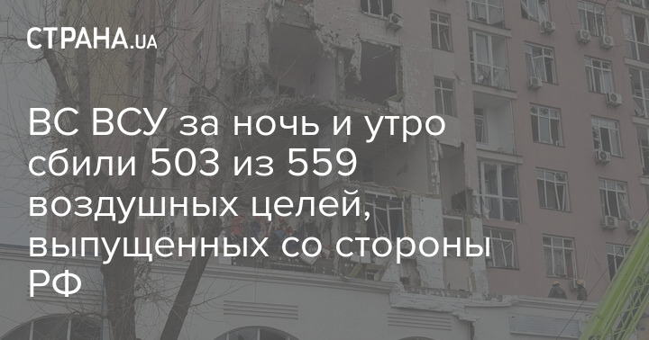 Во время ночной и утренней атаки украинской стороной было сбито 503 из 559 целей. Всего для атаки было задействовано 40 ракет и 519 БПЛА.