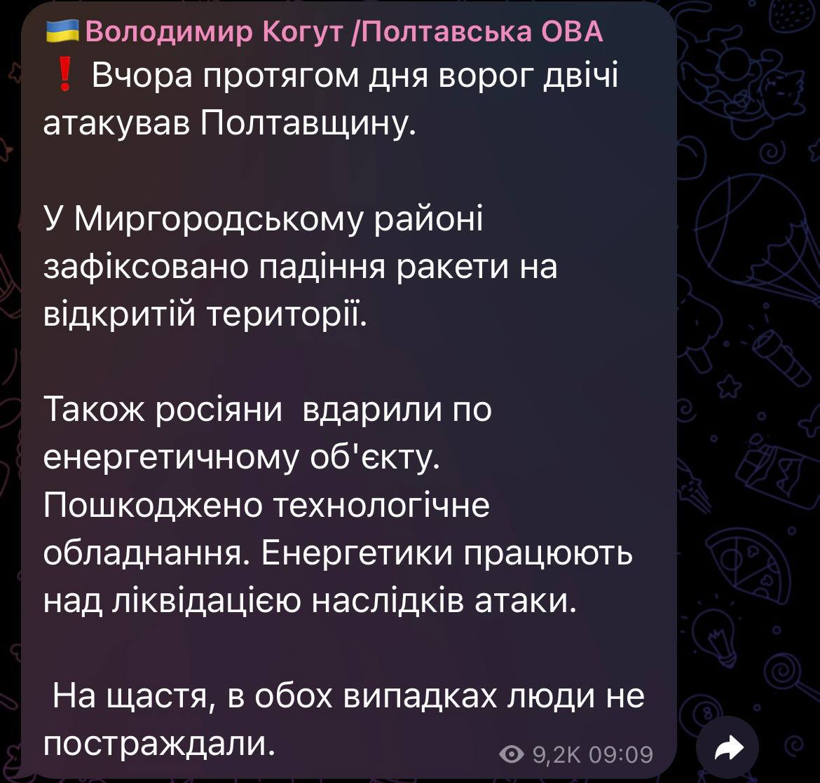 12:48 В Полтавской области есть прилеты в объект энергетики, сообщил глава Полтавской ОВА Когут.