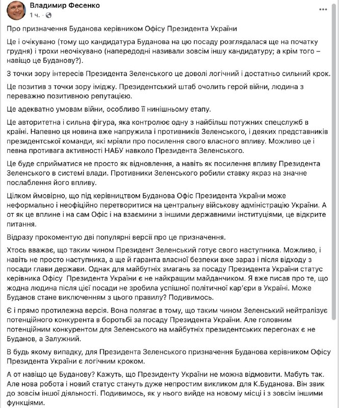 "Кто-то считает, что таким образом президент Зеленский готовит своего преемника (на посту президента - Ред.). Возможно, и даже не просто преемника, а еще и гаранта собственной безопасности уже сейчас и после ухода с поста главы государства. Однако для будущих соревнований за пост президента Украины статус руководителя Офиса президента Украины является не лучшей площадкой. Я уже писал о том, что ни один человек после этой должности не сделал успешной политической карьеры в Украине. Может Буданов станет исключением из этого правила? Посмотрим", - пишет Фесенко.
