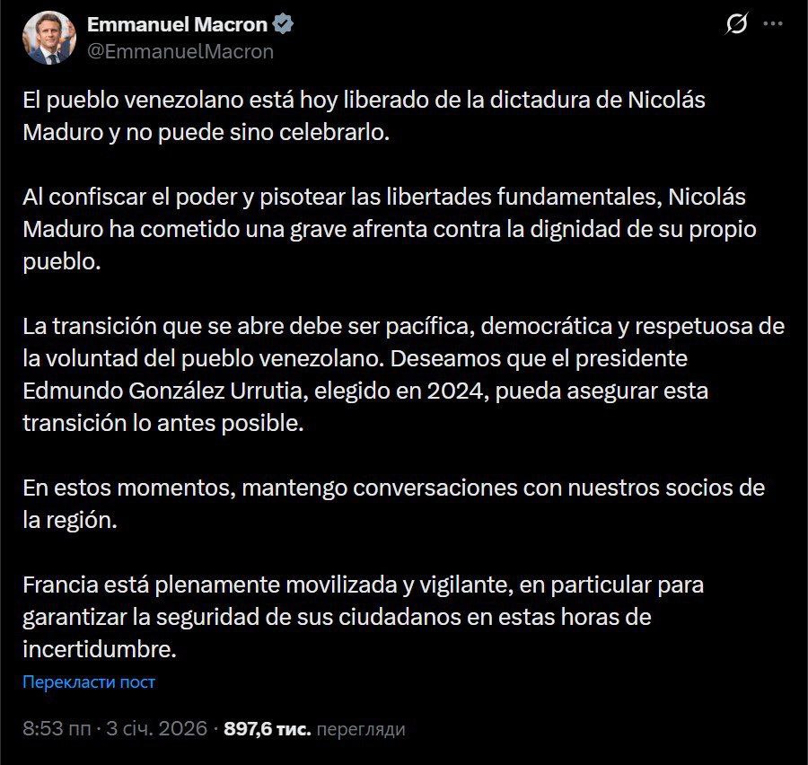 "Переходный период, который начинается, должен быть мирным, демократичным и уважительным к воле венесуэльского народа. Мы надеемся, что президент Эдмундо Гонсалес Уррутия, избранный в 2024 году, сможет обеспечить этот переход как можно быстрее. В настоящее время я веду переговоры с нашими партнерами в регионе", - написал Макрон.