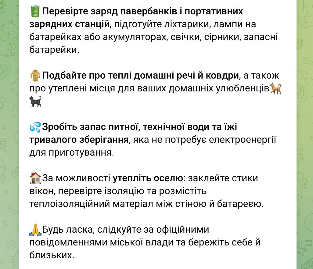 15:22 КГГА призывает жителей Киева заряжать павербанки, готовиться к походам в пункты обогрева и запасаться водой из-за похолодания и возможных обстрелов объектов энергетики. Также предлагается запасаться свечками, одеялами и заранее заклеить окна изоляционными материалами.