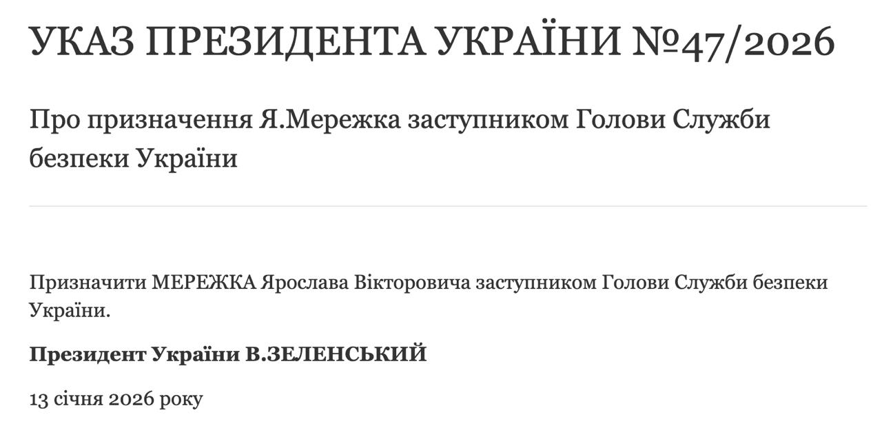 "Назначить Мережко Ярослава Викторовича заместителем председателя Службы безопасности Украины", - говорится в документе.