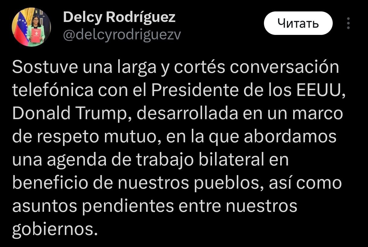 И.о. президента Венесуэлы в свою очередь сообщила в Х, что провела с Трампом "долгий и вежливый телефонный разговор", который прошел "в атмосфере взаимного уважения".