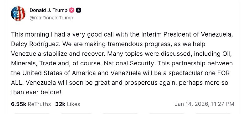 "Сегодня утром у меня был очень хороший разговор с исполняющей обязанности президента Венесуэлы Делси Родригес. Мы добиваемся колоссального прогресса, помогая Венесуэле стабилизироваться и восстановиться. Обсуждались многие темы, включая нефть, полезные ископаемые, торговлю и, конечно, национальную безопасность", - заявил Трамп.