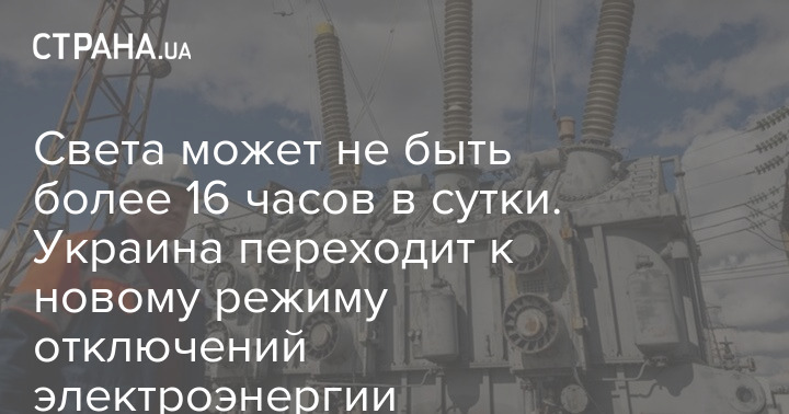 Украина переходит к режиму отключений света, при котором электроснабжения у бытовых потребителей может не быть более 16 часов в сутки. Новый график будет предполагать 4,5-5 очередей плановых отключений.