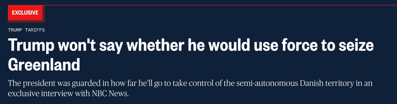 Президент США Дональд Трамп не стал отвечать на вопрос телеканала NBC News, готов ли он использовать армию для захвата Гренландии.