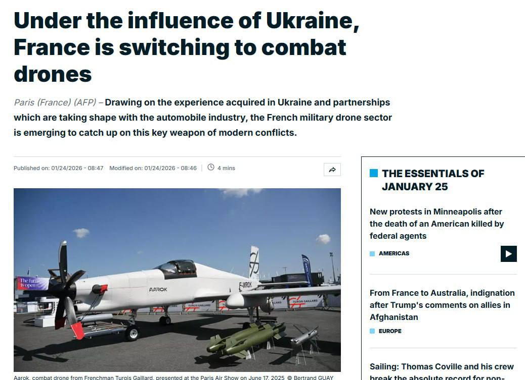 "Французская группа EOS Technologie разработала беспилотник Rodeur, некоторые экземпляры которого уже поставлены в Украину. Он способен преодолевать расстояние до 500 км и находиться в воздухе до пяти часов. Эта модель, способная выполнять как разведывательные задачи, так и атаки "камикадзе", может использоваться в Европе скорее в качестве "щита", а в Украине - в качестве "меча", - пишет France24 со ссылкой на президента EOS Technology Жан-Марк Зулиани.