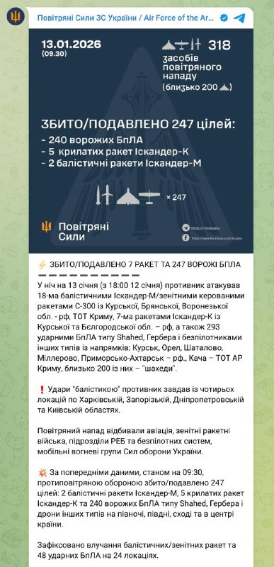11.31 Воздушные силы ВСУ опровергают заявление эксперта Харченко о том, что киевские ТЭЦ 13 января атаковали 16 баллистических ракет. Спикер Игнат заявил, что в тот день в Киеве были прилеты только 2 баллистических ракет, остальные били по Харьковской, Запорожской, Днепропетровской и Киевской областям.