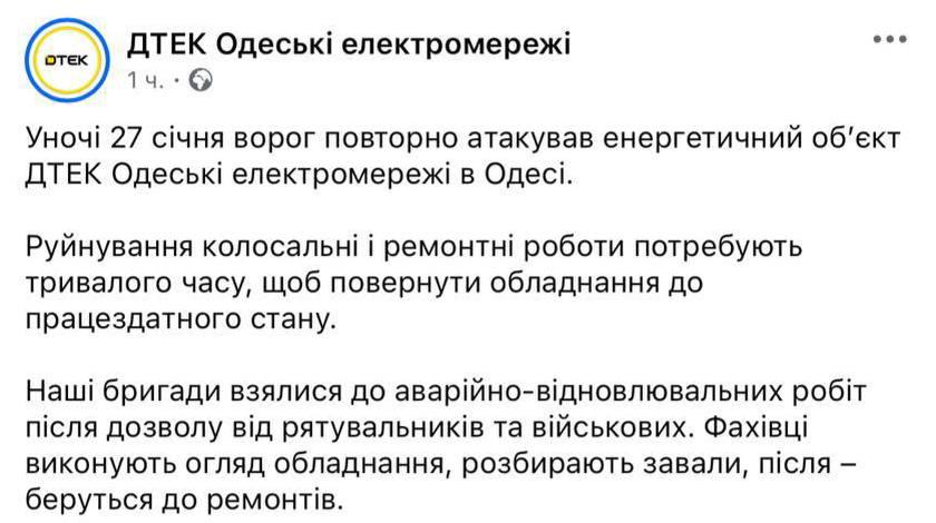 10.31 В Одессе ночью был повторный прилет по объекту энергетики, "разрушения колоссальные", ремонт займет длительное время, сообщает ДТЭК.