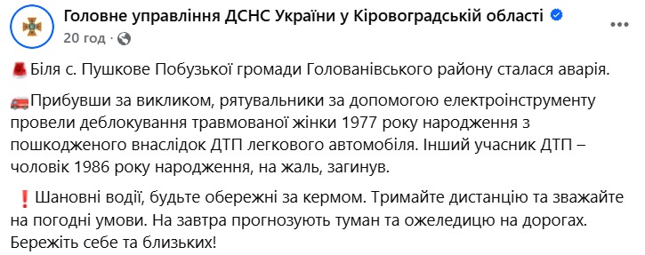 "Возле с. Пушковое Побужской громады Голованивского района произошла авария. Прибыв по вызову, спасатели с помощью электроинструмента провели деблокирование травмированной женщины 1977 года рождения из поврежденного в результате ДТП легкового автомобиля. Другой участник ДТП — мужчина 1986 года рождения, к сожалению, погиб", - говорится в публикации.