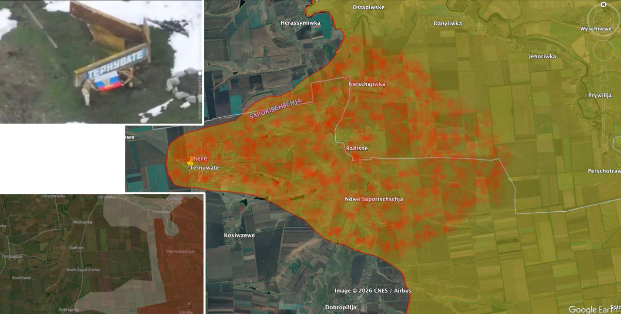 "Российская армия вторжения захватила Терноватое в Запорожской области, подчеркнув, что предыдущие видео с флагами из Нечаевки, Радостного и Нового Запорожья были не просто "флаговыми трюками", а отражали территориальные продвижения в этом районе", - написал Рёпке.