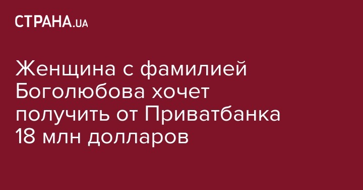 10 января 2017 Елена Боголюбова обратилась в Жовтневый районный суд Днепра с иском к Приватбанку о взыскании 18 283 698,72 долларов, 1 942 967,79 евро и 52 395 063,84 гривен. Кроме этого, Елена Леонидовна требует у банка компенсировать ей 14 310 441,88 грн морального ущерба. Истица просит у банка копии своих договоров, сообщает Zabeba.li