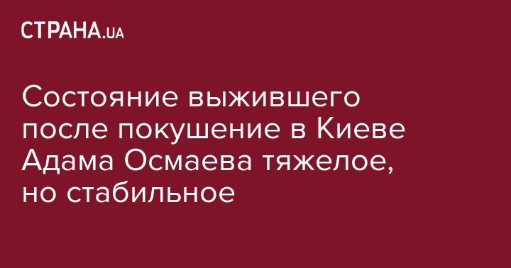 По состоянию на вечер четверга, 1 июня 2017 состояние пережившего покушение в Киеве участника АТО Адама Осмаева тяжелое, но стабильное.