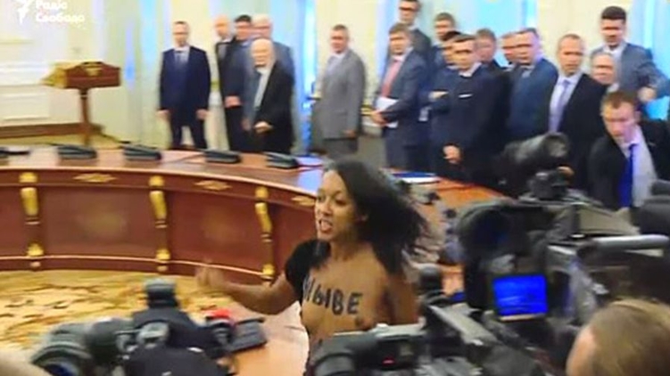 С брифинга Порошенко и Лукашенко вышвырнули скандальную темнокожую активистку, обнажившую грудь