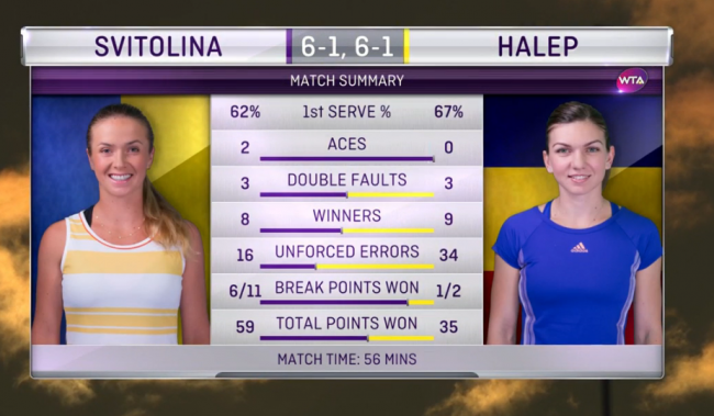 Элина свой матчбол не реализовала, а Симона со второй попытки сделала брейк. Однако, вернуть интригу Халеп не смогла, проиграв следующий гейм на своей подаче. Таким образом, украинка взяла реванш у соперницы за поражение в четвертьфинале Ролан Гаррос.