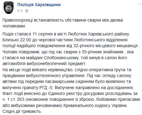 "В Люботине Харьковской области 11 августа около 22:00 к правоохранителям обратился 32-летний местный житель. Он отметил, что во время ссоры с 35-летним знакомым, которая произошла на площади Слобожанской, тот бросил в салон его автомобиля взрывоопасный предмет", - уточнили в полиции.