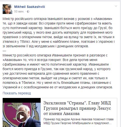 Так Саакашвили на своей старнице в Facebook прокомментировал эксклюзив "Страны" о том как главу МВД Грузии разыграл пранкер Лексус от имени Авакова.