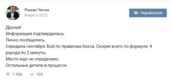"Друзья! Информация подтвердилась, лично пообщались. Середина сентября. Бой по правилам бокса, скорее всего, по формуле: 4 раунда по 2 минуты. Место еще не определено, остальные детали - в процессе", - написал журналист.