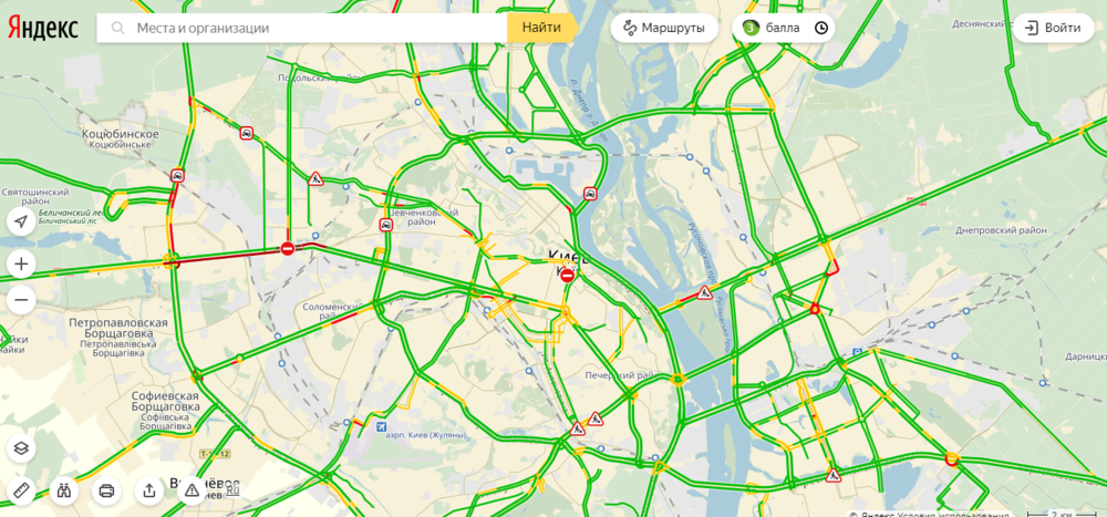 Данные на "Яндекс Пробки" показывают, что причиной затора в направлении центра города является ремонт моста Нивки, из-за чего на трассе введены ограничения движения.
