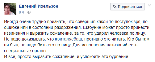 Евгений Ихельзон, блогер, путешественник: "Иногда очень трудно признать, что совершил какой-то поступок зря, по ошибке или в состоянии раздражения. Шабунин может просто принести извинения и выразить сожаление, за то, что ударил человека по лицу. Не надо доказывать, что #виталяебаш, противно это читать. Кто бы там ни был, не надо бить его по лицу. Для исполнения наказаний есть специальные органы. И все, просто выразить сожаление, и успокоить это бурление".