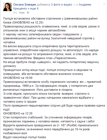Напомним, что сегодня в центре Киева неизвестные вышли из автомобиля Аudi и напали на представителя фирмы, у которого в сумке было 400 тыс. грн. В результате нападения, мужчина получил огнестрельные ранения, ушибы от дубинки и ссадины и был в срочном порядке госпитализирован.