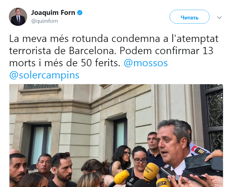 "Можем подтвердить, что 13 человек погибли и более 50 ранены", - написал в Twitter-микроблоге советник по внутренним делам правительства Каталонии Жоакин Форн.