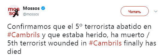 Полиция Каталонии заявила, что скончался пятый терорист, раненный во время новой атаки в Камбрильсе, которая должна была повторить барселонский теракт. Такое заявление появилось в Twitter полиции.