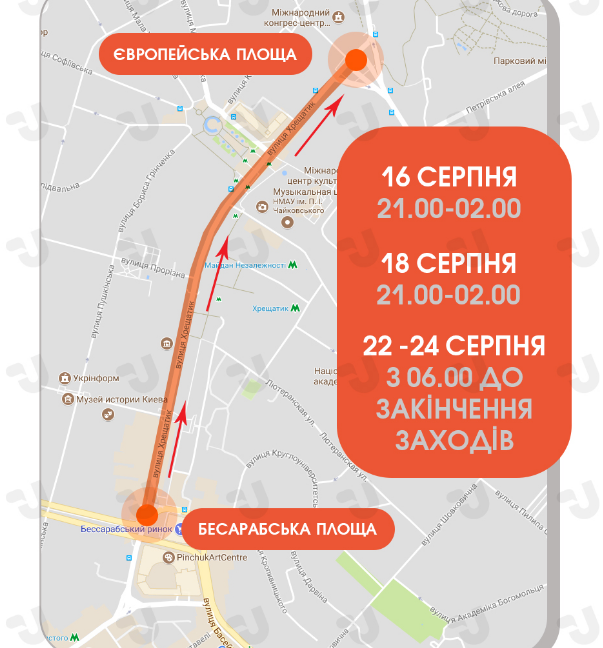 Также Крещатик будет перекрыт для движения машин 22-24 августа с 06.00 до окончания мероприятий.