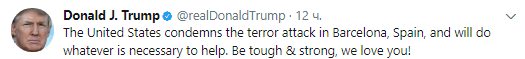 "Соединенные Штаты осуждают террористический акт в Барселоне, Испания, и готовы сделать все необходимое, чтобы помочь. Будьте сильными, мы любим вас", - написал президент США.