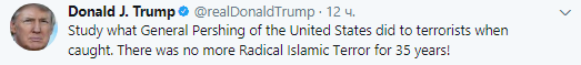 "Учитесь у генерала Першинга, что делать с террористами после их поимки. Он лишился исламских радикалов на 35 лет", - написал Трамп.