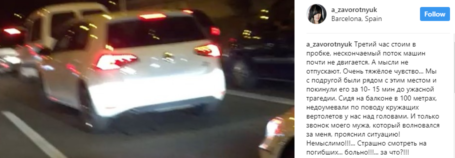 "Третий час стоим в пробке, нескончаемый поток машин почти не двигается. А мысли не отпускают. Очень тяжёлое чувство... Мы с подругой были рядом с этим местом и покинули его за 10- 15 мин до ужасной трагедии. Сидя на балконе в 100 метрах, недоумевали по поводу кружащих вертолетов у нас над головами. И только звонок моего мужа, который волновался за меня, прояснил ситуацию! Немыслимо!!!... Страшно смотреть на погибших... больно!!!... за что?!!!" - написала она.