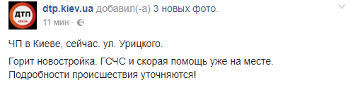 "ЧП в Киеве, сейчас. ул. Урицкого. Горит новостройка. ГСЧС и скорая помощь уже на месте.