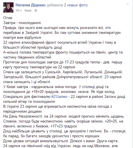 "Словом, погода будет нежаркой, даже скорее свежей, +20 - +25, на севере, включая Киев, +17 - +23 градуса. Дождь больше всего интересует в столице, это понятно и логично. Потому что - столица, потому что парад, потому что много мероприятий торжественных и просто хороших. 24 августа на северо-восток от Украины, едва не над Москвой, но ближе к Смоленску, будет находиться центр циклона, который, циклон, будет пытаться именно в этот день все время забрасывать на нас дождь. Наиболее вероятно на Сумскую, Харьковскую и часть Черниговской области. Значительная же часть Украины будет в солнце. А вот с Киевом - все время на грани, дождь дотянет-не дотянет, забросит-не упрекнет", - рассказала Диденко.