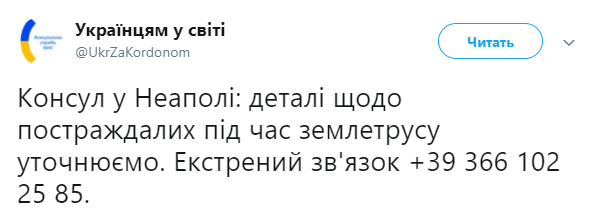 "Детали относительно пострадавших во время землетрясения уточняем. Экстренный связь +39 366 102 25 85", - сообщил консул Украины в Неаполе.