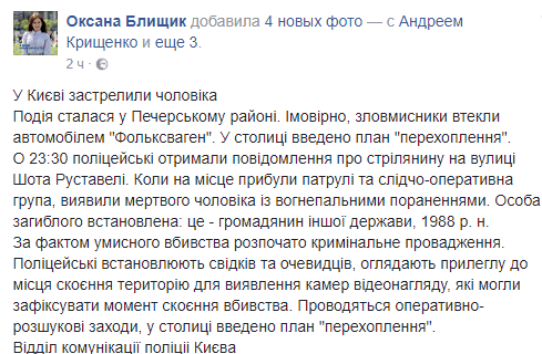 В Печерском районе Киева ночью застрелили гражданина другого государства. Об этом в Facebook сообщила начальник отдела коммуникаций Нацполиции Киева Оксана Блищик.