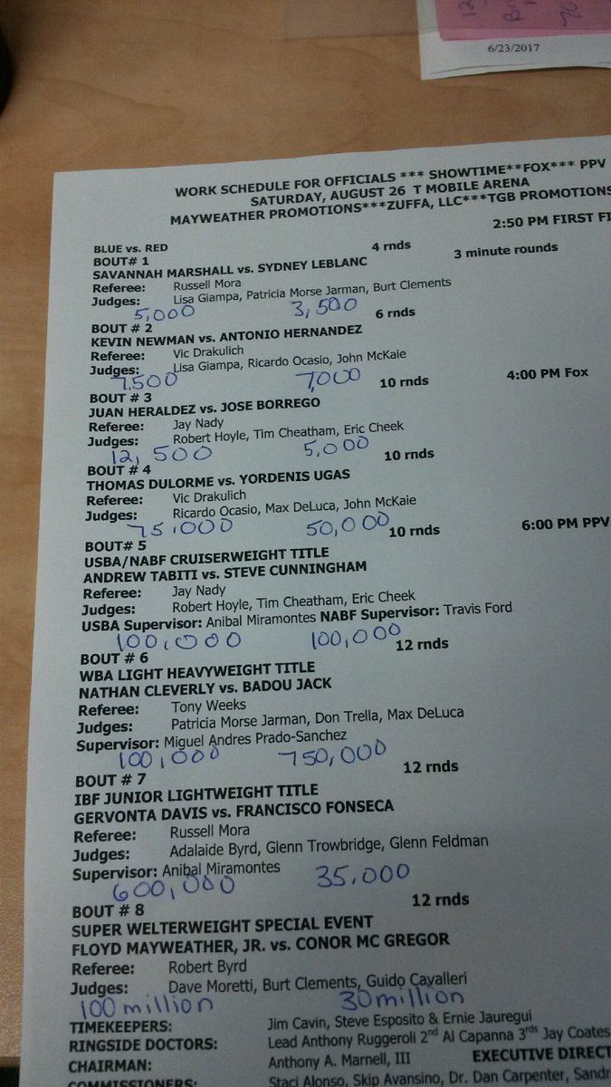 Атлетическая комиссия штата Невада назвала официальные гонорары вечера бокса в Лас-Вегасе за бой экс-чемпиона мира в пяти весовых категориях Флойда Мейвезера и чемпиона UFC в легком весе Конора Макгрегора. Об этом сообщают "Украинские Новости".