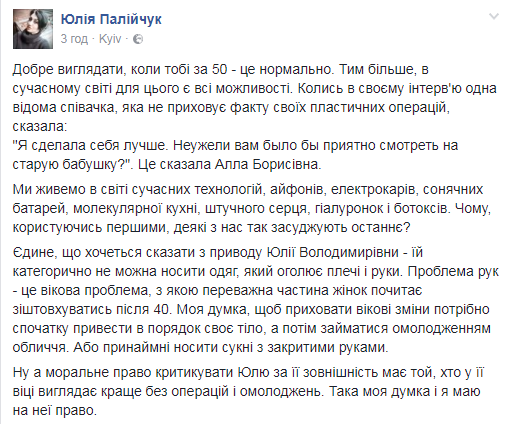 Ну а моральное право критиковать Юлю за ее внешность имеет тот, кто в ее возрасте выглядит лучше без операций и молодыми. Таково мое мнение и я имею на него право", - написала Юлия Палийчук.